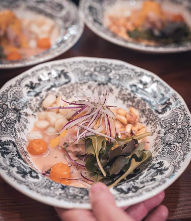 - Fresco y vibrante, preparado con pescado y mariscos marinados en limón, ají limo y cebolla roja, acompañado de camote, choclo y cancha serrana.