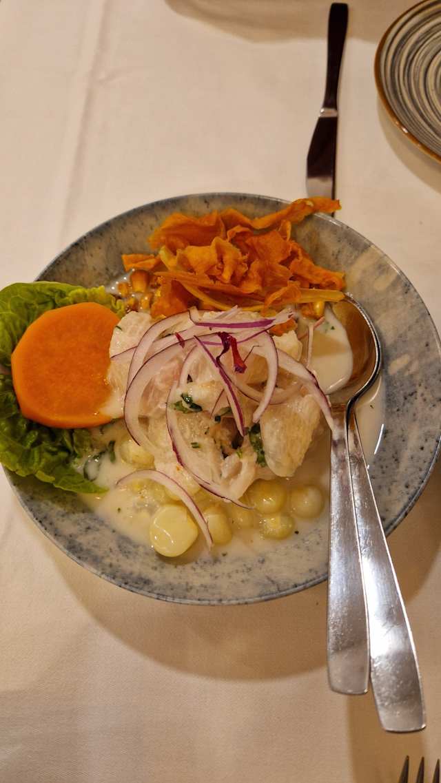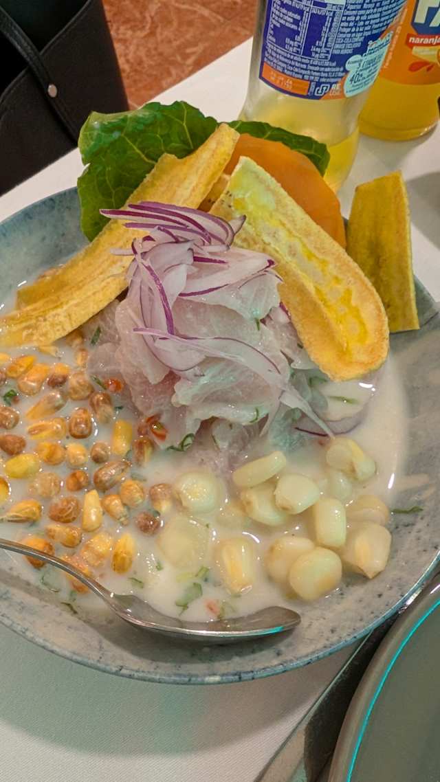 Pesca del día, leche de tigre, ají limo, choclo, cancha y boniato.