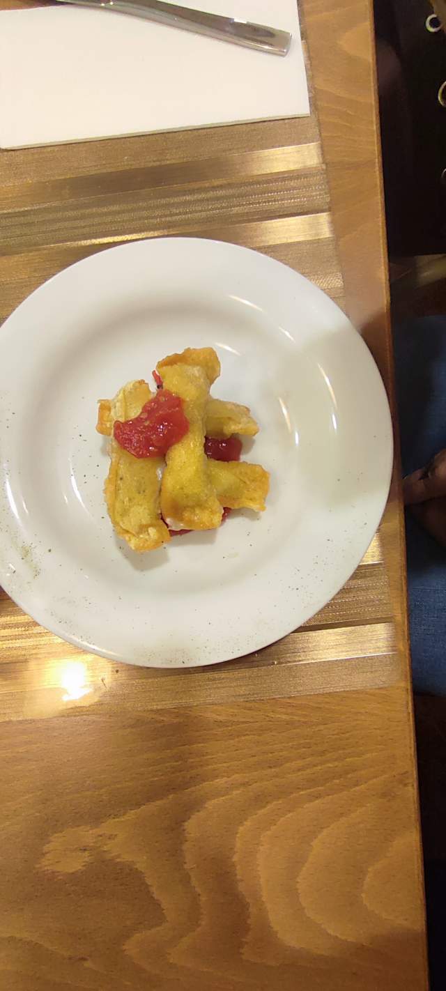 - Pesca del día rebozada y frita, con sarza criolla y cremas de la casa.
