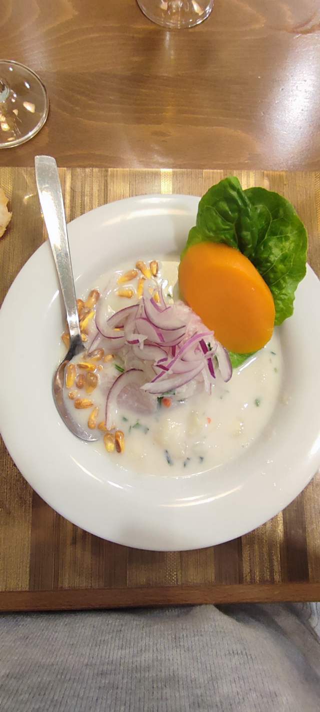 - Pesca del día, leche de tigre, ají limo, choclo, cancha y boniato.
