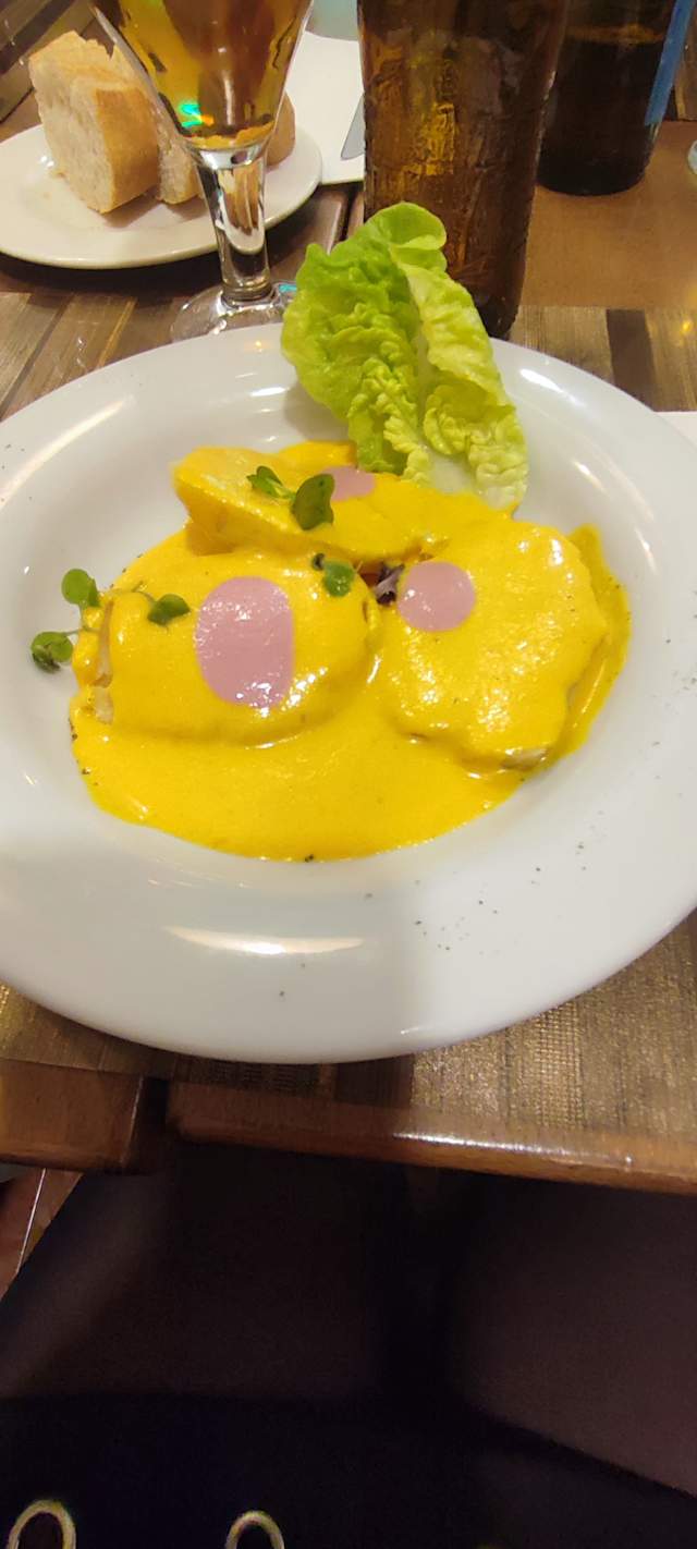 - Crema de ají amarillo con pollo desmechado, huevo, patatas y queso parmesano.