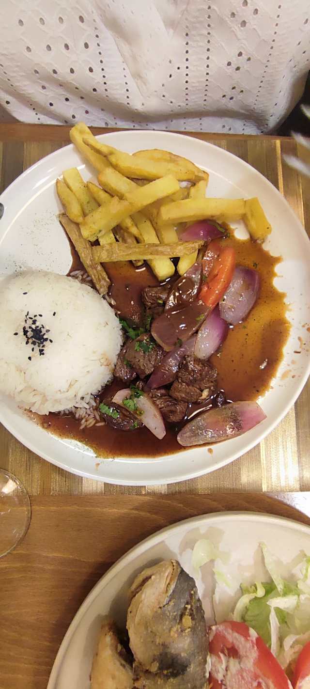 - Suaves cortes de corazón de ternera, patatas doradas y salsa huancaína.