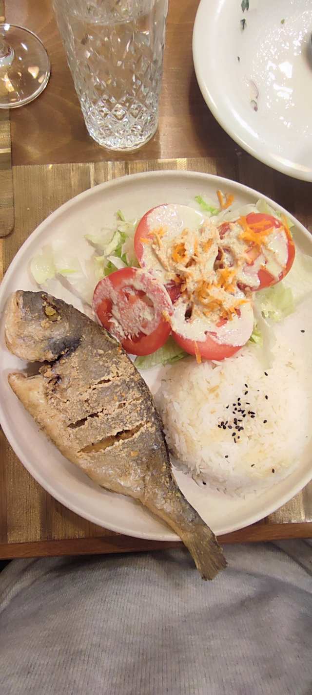 - Pesca del día acompañada de choclo, cancha, boniato y chicharrón de pescado.