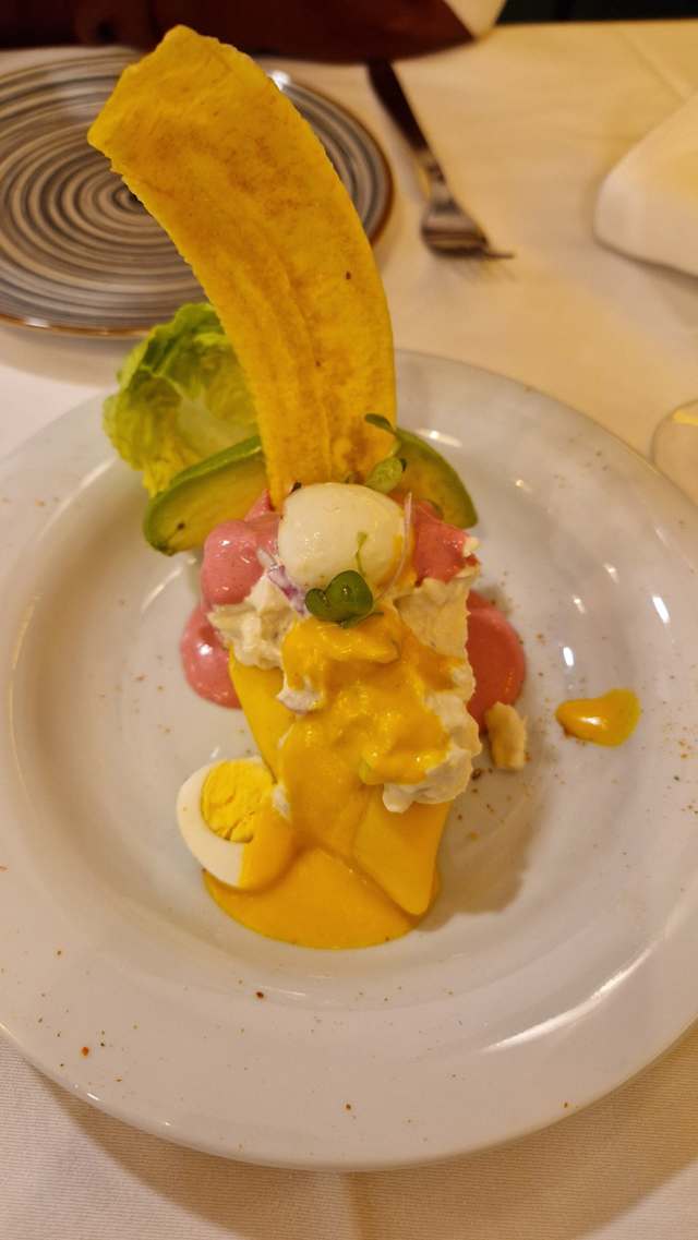 Roll de causa con ensaladilla de pollo, aguacate y mayonesa de oliva. Sabor tradicional y emplatado creativo.