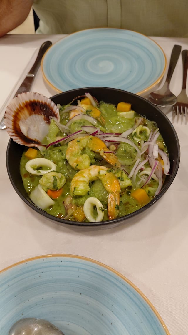 Ceviche de autor, leche de tigre de cilantro, pesca del día y frutos del mar cocidos y aguacate hass