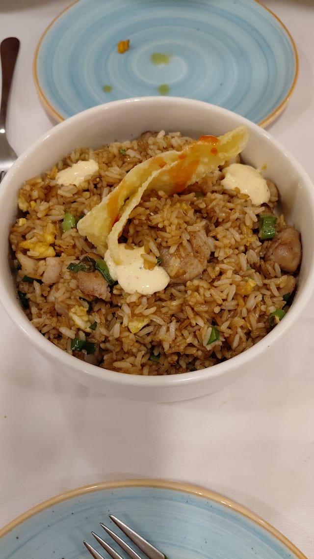 Frutos del mar al wok con arroz salteado en salsa oriental y mayonesa umami