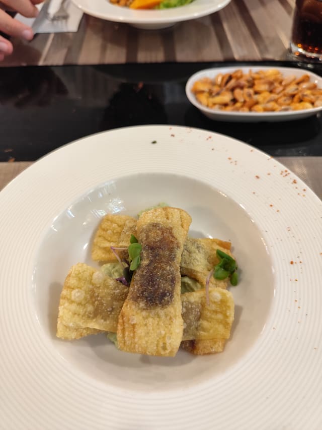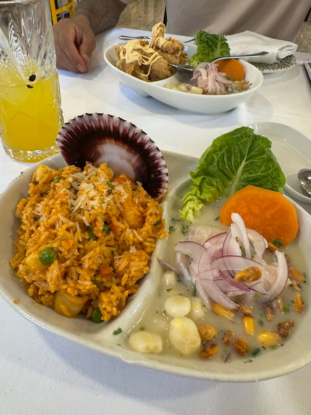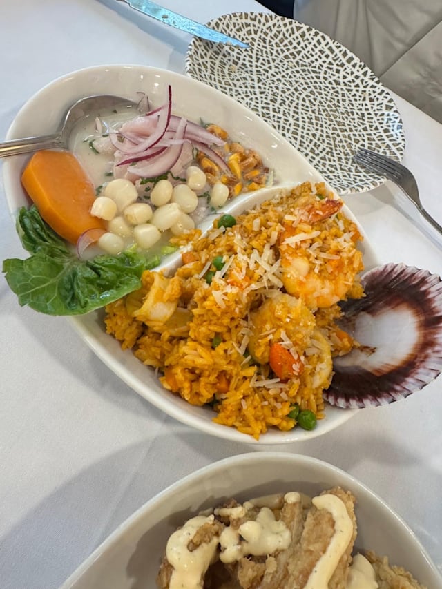 Nuestro chef le deleita con la versión de ceviche arrocotado limanta, con su toque picante, a base de pesca del día, frutos del mar cocidos, chicharrón mixto y crujientes de boniato y chifle.