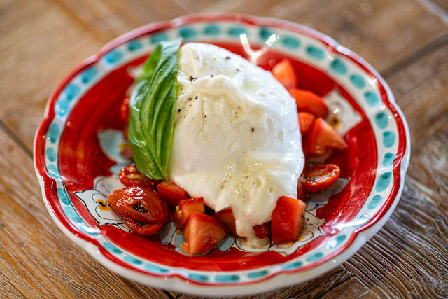 Experimenta la delicia cremosa de la burrata italiana con tomate, pesto casero de albahaca, aceite de oliva y aceitunas negra en polvo