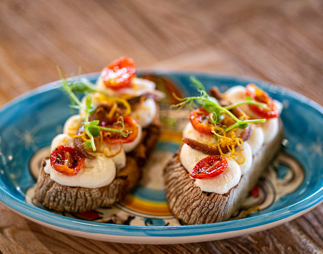 Experimenta los sabores de la costa con pan de tinta de calamar cubierto con crema búfala, tomates cherry, limón confitado, anchoas y bottarga (huevos de corvina curados)