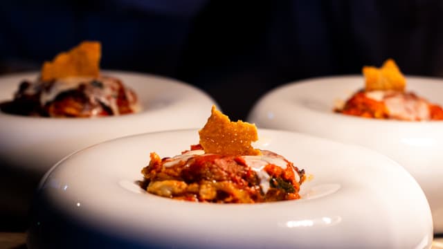 caramelizada, queijo parmegiano em 3 texturas: crocante, derretido e gelado