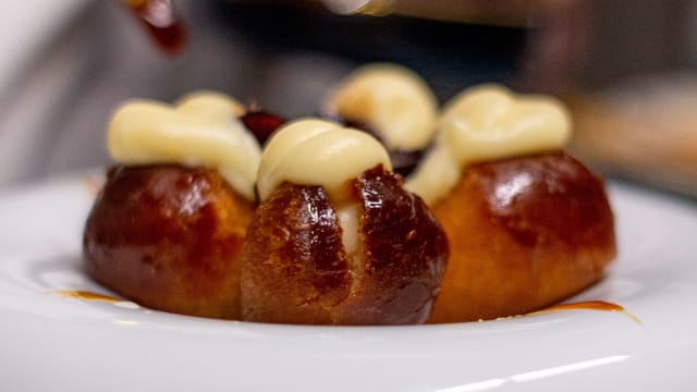 profiteroles caseiros recheados com nosso gelado e servidos com una ganache de chocolate quente