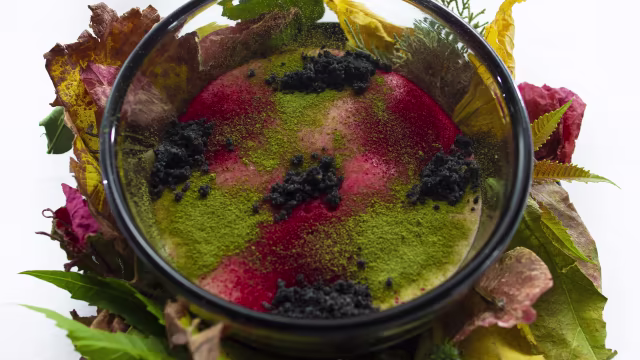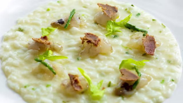 - Riso acquerello' cotto in brodo di cicale, crudo di cicale, salsa ricci, aglio nero e limone