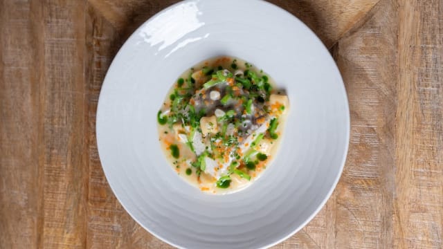Terminada al vapor de lemongrass, guiso meloso de verduritas y navajas, ñoquis de ñame, aceite de lima keffir y cebollino.