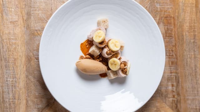 Plátano con dulce de leche en varias texturas, namelaka de plátano con helado y dulce de leche natural y crumble de cacahuete