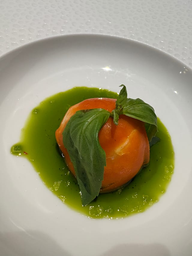 - Battuto di tonno vegetale condito con capperi di salina, pomodori secchi, olive taggiasche, e shichimi togarashi. Granella di pistacchi di sicilia, stracciatella vegetale, foglie e pesto di rucola