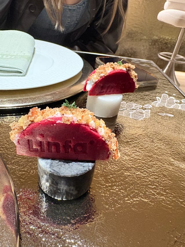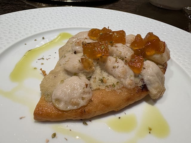 - Zucca hokkaido marinata karaage, maionese leggermente piccante, sakura mix, foglie di oro alimentare