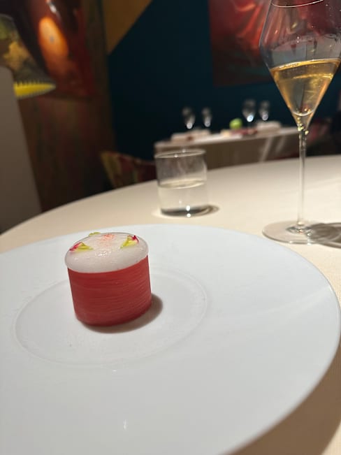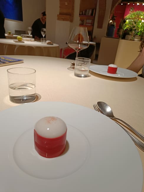 10/10+5A Refined and Artistic Escape in San Gimignano Lenfa stands out as a place where culinary artistry meets visual inspiration. The welcome started with a sparkling tea, a light and aromatic surprise that set the tone for what was to come. The house-made butter was exceptional—rich, nuanced, and a perfect opening act. The sweetbread was perfectly crisp and tender, while the duck was cooked to perfection, bursting with layered flavors and care in execution. What truly sets Lenfa apart is how it engages all your senses. The interior is filled with color and personality—from the bold, surprising color palette to the vivid, inspiring paintings adorning the walls. Every corner feels thoughtfully composed, echoing the creativity that arrives on the plate.