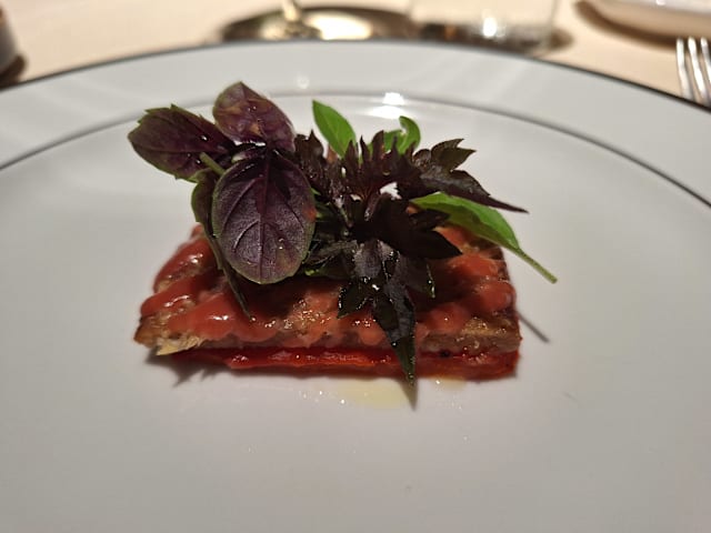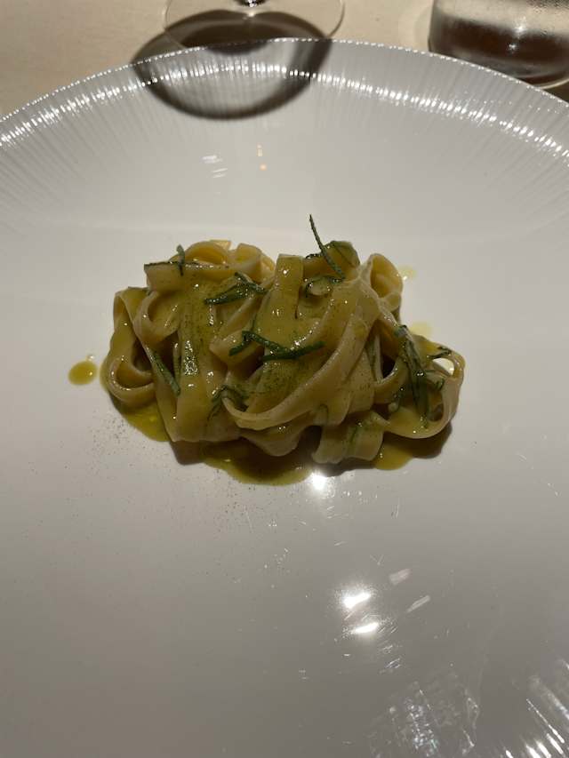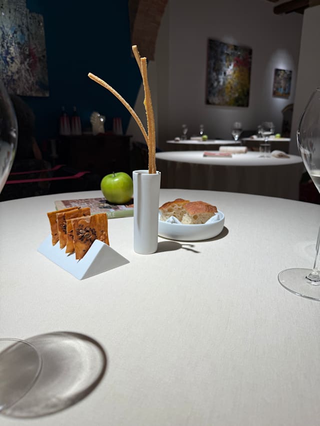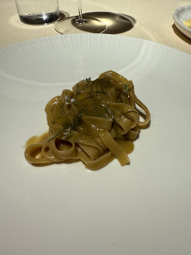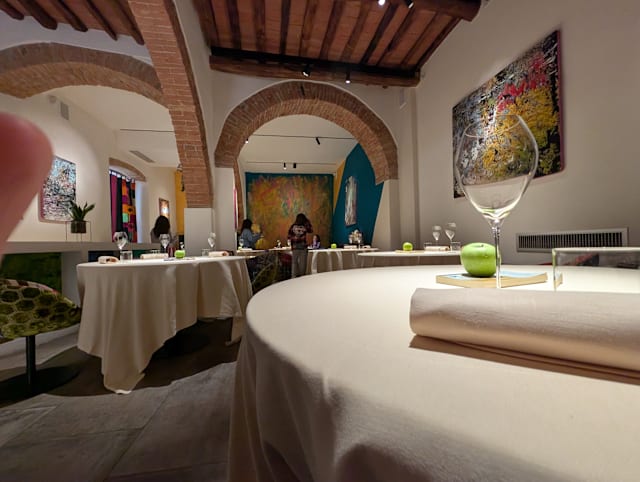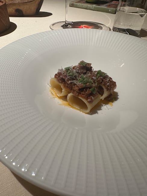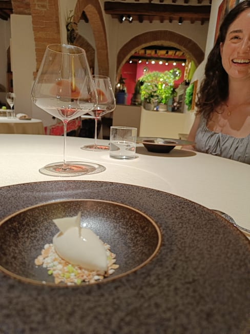9.5/10+2You walk in expecting something beautiful (this is Tuscany, after all) but you're not prepared for the restraint. No heavy-handed décor. No rustic clichés. Just an elegant space whispering, "we care more about what’s on your plate than what’s on our walls." Then it begins. What follows is a symphony of sea: fish dishes so delicate they feel like memories rather than meals. There’s depth. A fish dish that nearly made me weep, a duck course so perfectly seared it should be illegal in some countries. These people understand that food should taste like the place it comes from, not what you do to it.Then dessert lands, and it’s not an afterthought. It’s a finale. A beautiful crescendo. Layers of texture and temperature, sweet but never over bearing, artistic without being precious. It tells you the chef knows that the end matters just as much as the beginning. And the servers? Professionals. No performative hovering, no robotic recitations. Just people who know food and know wine. Go. Eat