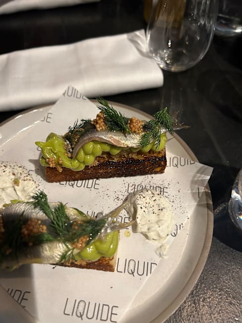 6.5/10The food is very good. 8 to 8.5 out of 10. At the same time, the dishes feel out of tune. Like someone with mediocre cooking skills trying to copy a great recipe. We were 2 adults and two school kids staying at Liquide for lunch. We had a very good cocktail, 4 starters and 3 mains (the kids shared one). The starters were better than the mains. The carpaccio St. jacks was very good, as were the fish roasts. My beef tartar in crab chips had a great taste. But there was so little meat, it was ridiculous. The portions are very small. I had to ask for bread (which was excellent) a second time and was still hungry when we left. The bread was a small bag with one peace per person. It was not refilled when empty. The main was ok, nothing special. Too many too weak flavors but in interesting combinations. The vegetable main was too fatty and not very tasty. We spent 200 Euros and did not even have desert. I left still hungry and I am not a fat person or huge eater. The price value ratio is very bad from my point of view. Another big disappointment was that one of Liebe Grüße the main course des was sold out at 1 pm. Then, to our dismay, they played rap music full of swear words. So our lunch was accompanied by lots of f*cks, b*tches, s*hits, and n*gger words. Our kids speak English. Some of the weighters did too - so no excuse. We will surely never return. I mentioned the music when we left and locked into embarrassed faces. To sum up: good food. At the same time poor price value relationship. Mediocre service and ambience.