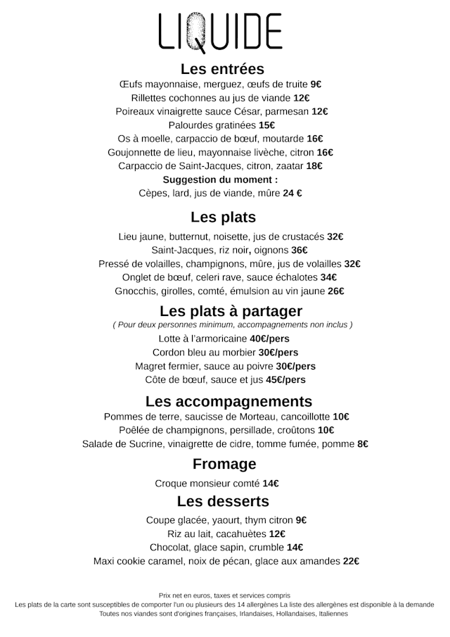 4.5/10We have eaten at Liquide several times before and had wonderful meals. This time the food quality was very poor and we had to send the main course back as it was totally undercooked. Worse the veal chop was extremely fatty and tough. The restaurant has gone from the top of our list to do not return