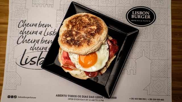 - Burger 100% angus (150g), cheddar, chouriço, ovo, jalapeños, molho americano em pão brioche e batata frita