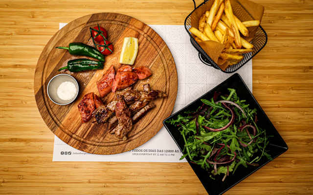 - Entrecôte grelhado, abacaxi assado, tomate cereja, pimentos padrón, mix de folhas e batata frita