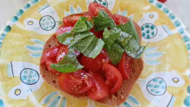 - A large wood-fired bruschetta topped with burrata, tomato and aubergines