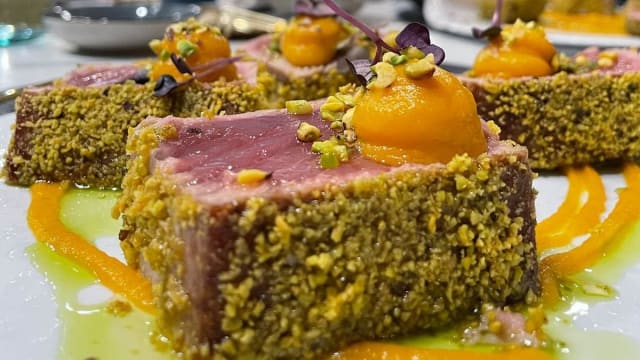 Seared tuna slice with caramelised onion and teriyaki sauce