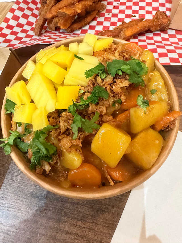 - Frite, patate douce, poulet teriyaki, crème fraîche, coriandre, jalapeño sauces: teriyaki et spicy