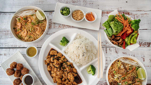 Fideos finos de arroz con base de verduras frescas, cebolla y huevo, acompañado de pollo, ternera, cacahuete picado y salsa de pimiento rojo dulce. ¡incluye el crunchy box! Cebollino, brotes de soja, lima y cacahuetes.