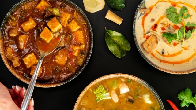 Sopa tailandesa con gambas, champiñones, pak choi, un toque de leche de coco y salsa tom yum, con un toque picante