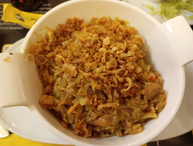 Ternera trinchada con base de cebolla, salsa de ajo y pimienta negra con un toque de cilantro. Acompañada con un delicioso bol de arroz