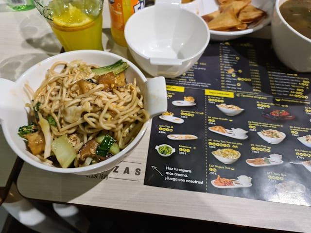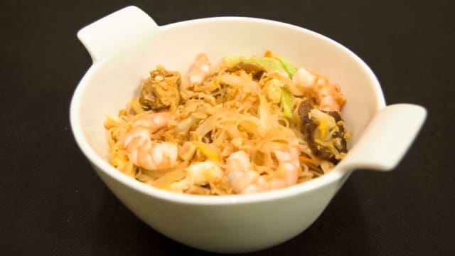 Fideos finos de arroz, con base de verduras frescas, cebolla y huevo, acompañado de pollo, ternera, gambas, cacahuete picado y salsa de pimiento rojo dulce.
