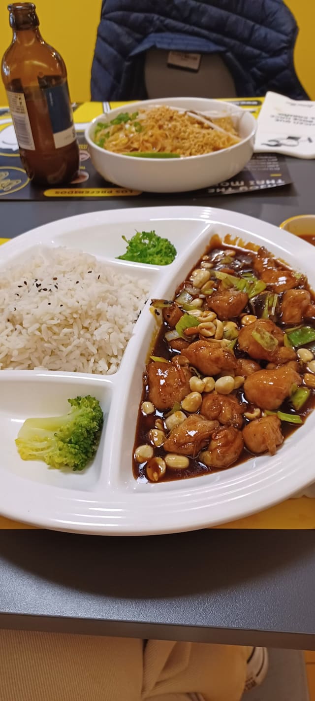 Fideos finos de arroz con base de verduras frescas, cebolla y huevo, acompañado de pollo, ternera, cacahuete picado y salsa de pimiento rojo dulce. ¡incluye el crunchy box! Cebollino, brotes de soja, lima y cacahuetes.