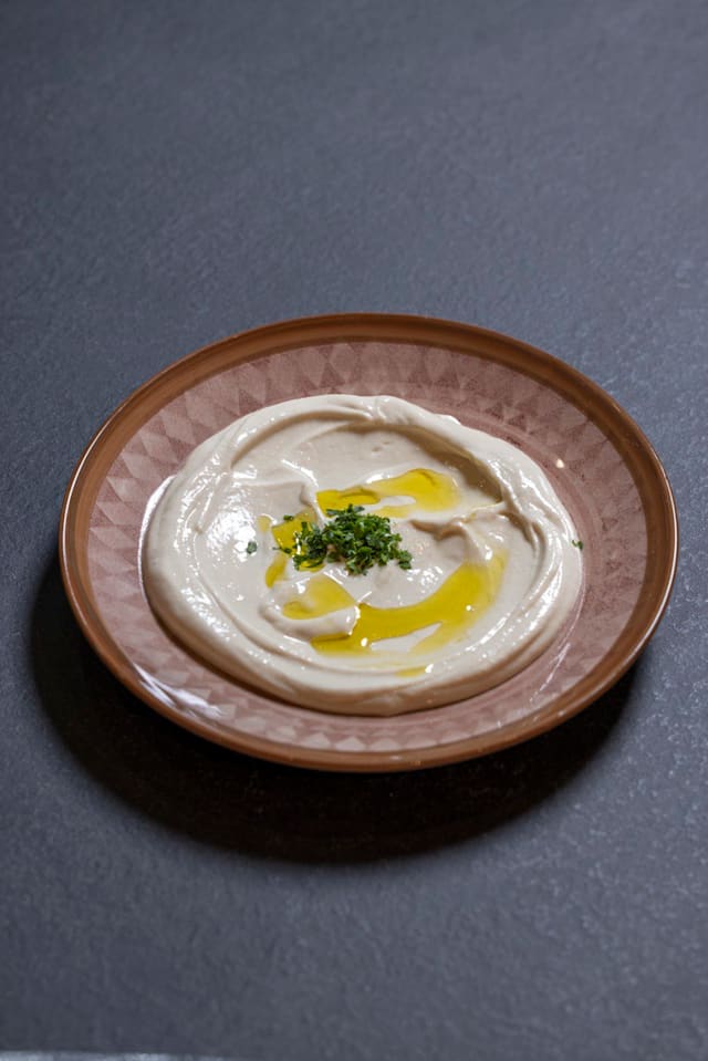 - Pita farcita con humus, melanzane fritte e uovo sodo
