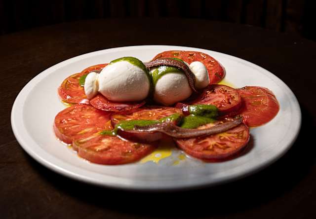 - Burrata sobre tomates de temporada con anchoas (ración)