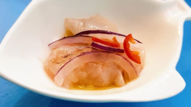 gambero bollito condito con mist0cotto, cipolla e colatura di alice
