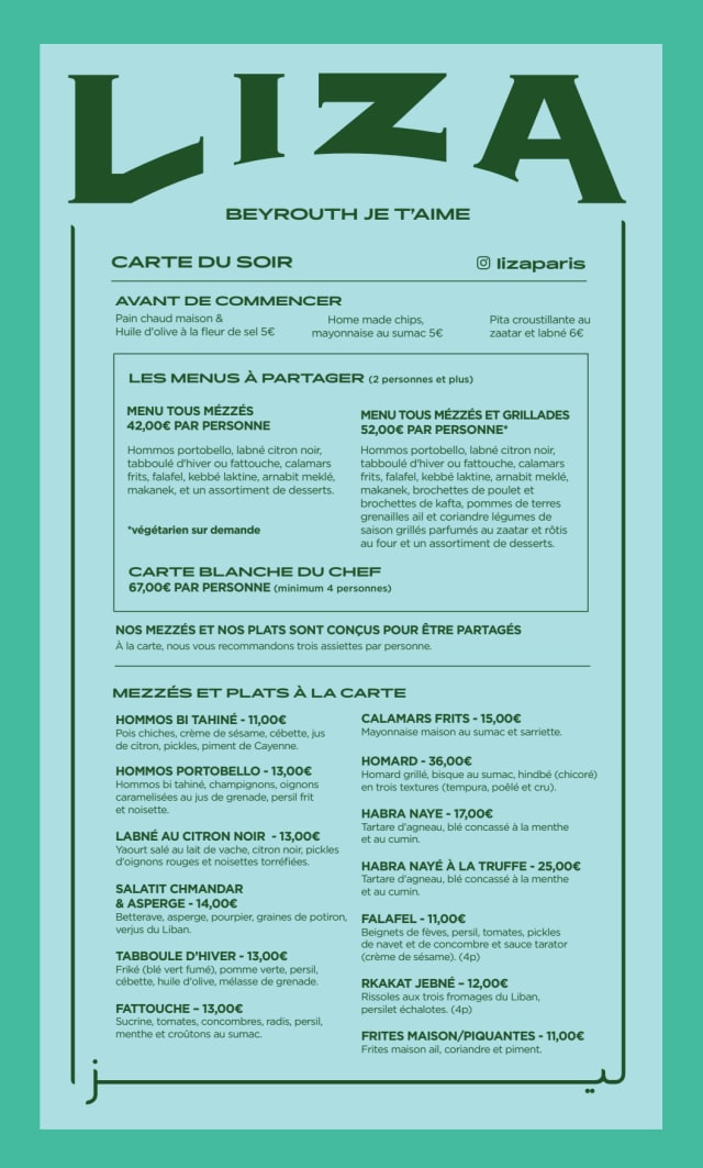 10/10We eat at Liza every time we come to Paris. The food is excellent and fresh…the kibbeh is amazing! The service is wonderful and welcoming. The interior has a contemporary feeling with lit candles which lends to having a beautiful yet relaxed evening with friends or family.