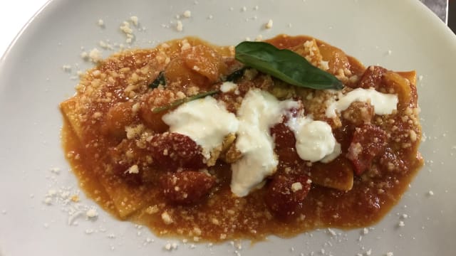 Ravioli ripieni di ricotta e spinaci fatti in casa ai tre pomodori e stracciatella di bufala