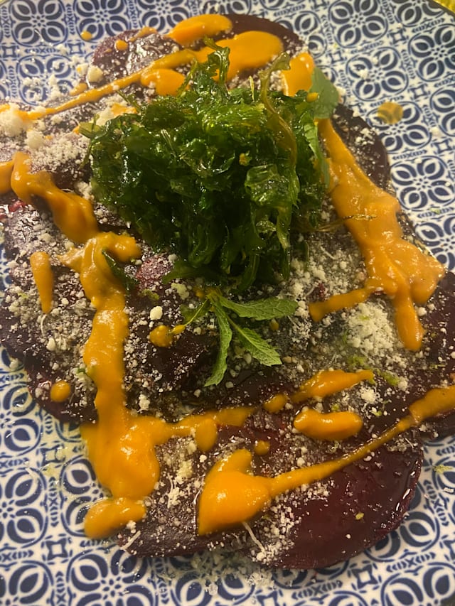 Carpaccio di rapa rossa, dressing di crema di zucca arrosto, riduzione di balsamico e rucola croccante