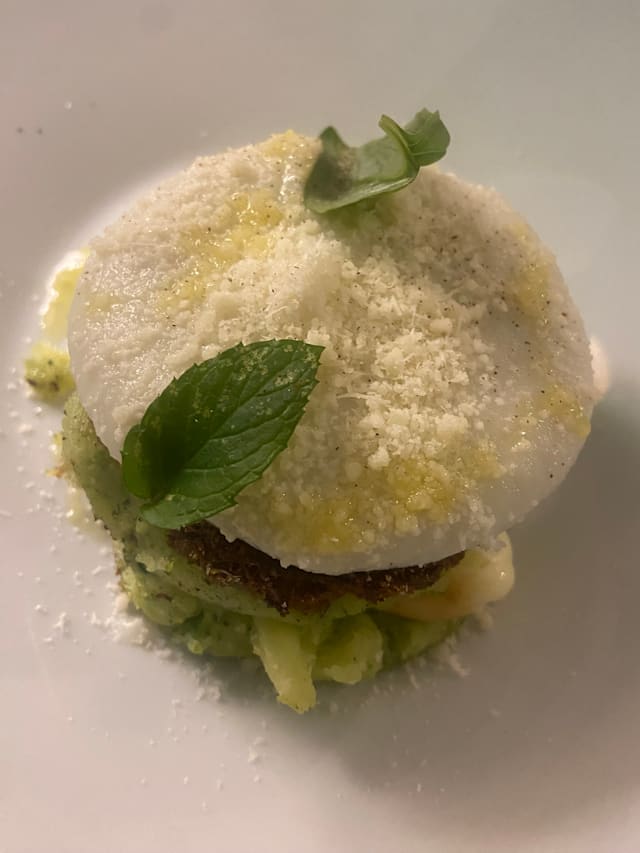 Polpette di patata schiacciata, scarole, olive nere e provola su crema di zucchine