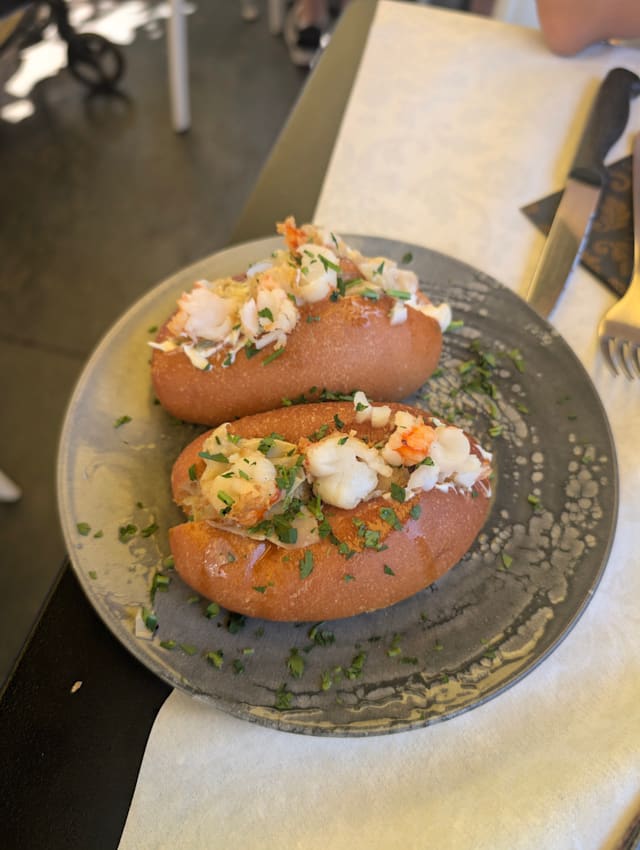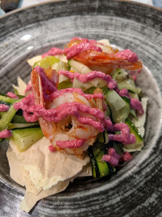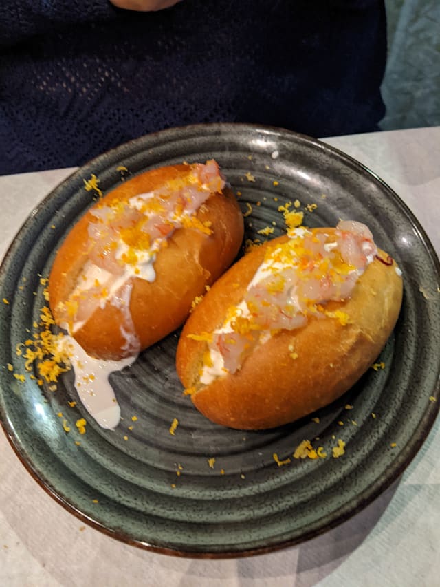 Maritozzi salati con crudite di gamberi rossi, stracciata e zeste di agrumia