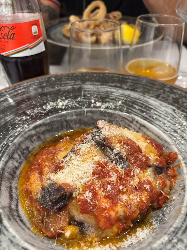 Parmigiana di melanzane con sbriciolata di salsiccia con fonduta di provola