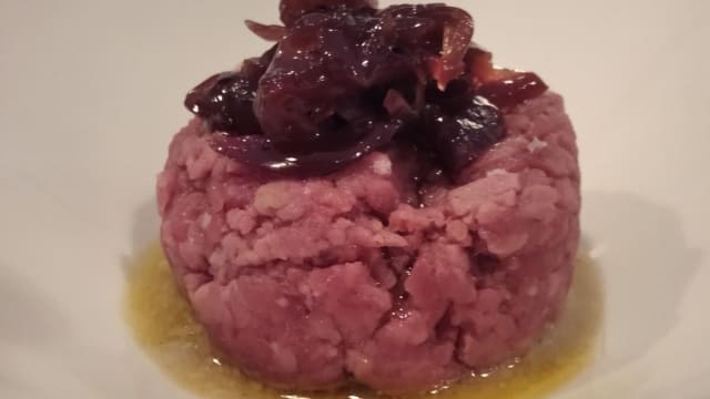 Battutta di fassona piemontese su crema di blue e cipolle caramellate