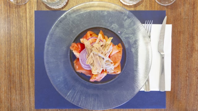 Tomate aliñado con ventresca de bonito y cebolla morada