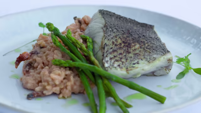 - Arroz caldoso de bacalhau, bochechas panadas, espargos, ovos escalfados e coentros cod broth rice, breaded cheek