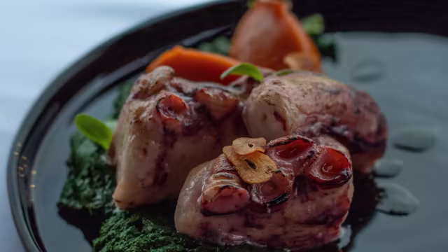 - Polvo com cebola caramelizada, puré de batata doce e legumes