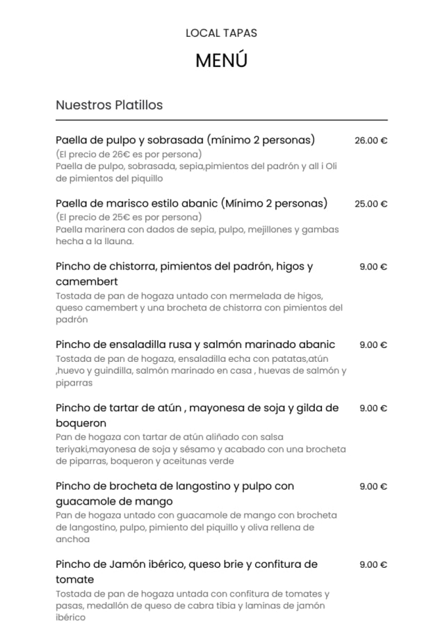 10/10Local Tapas is a true gem in Barcelona! From the moment you walk in, you’re greeted with warm smiles and a lively, welcoming atmosphere. The tapas are simply outstanding – fresh, creative, and full of flavor. Abby, our lovely waitress, made the evening even better with her friendly personality and great menu suggestions. Every bite was a delight, and the service was top-notch. Five shining stars – can’t wait to come back! 🌟🌟🌟🌟🌟