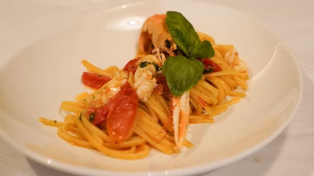 Handcrafted gragnano spaghetti venetian “busara” style with scampi, prawns and yellow cherry tomatoes