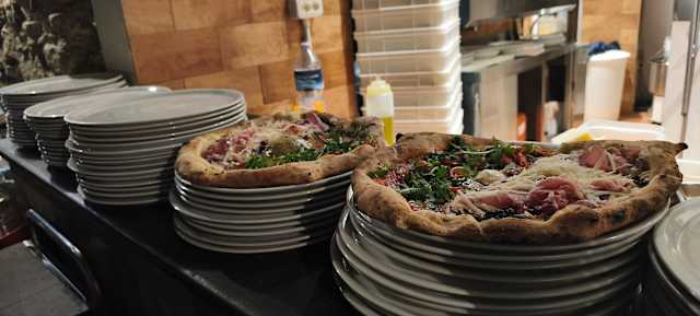 - Pizza etna con pomodoro, mozzarella, salame piccante, parmigiano, funghi porcini